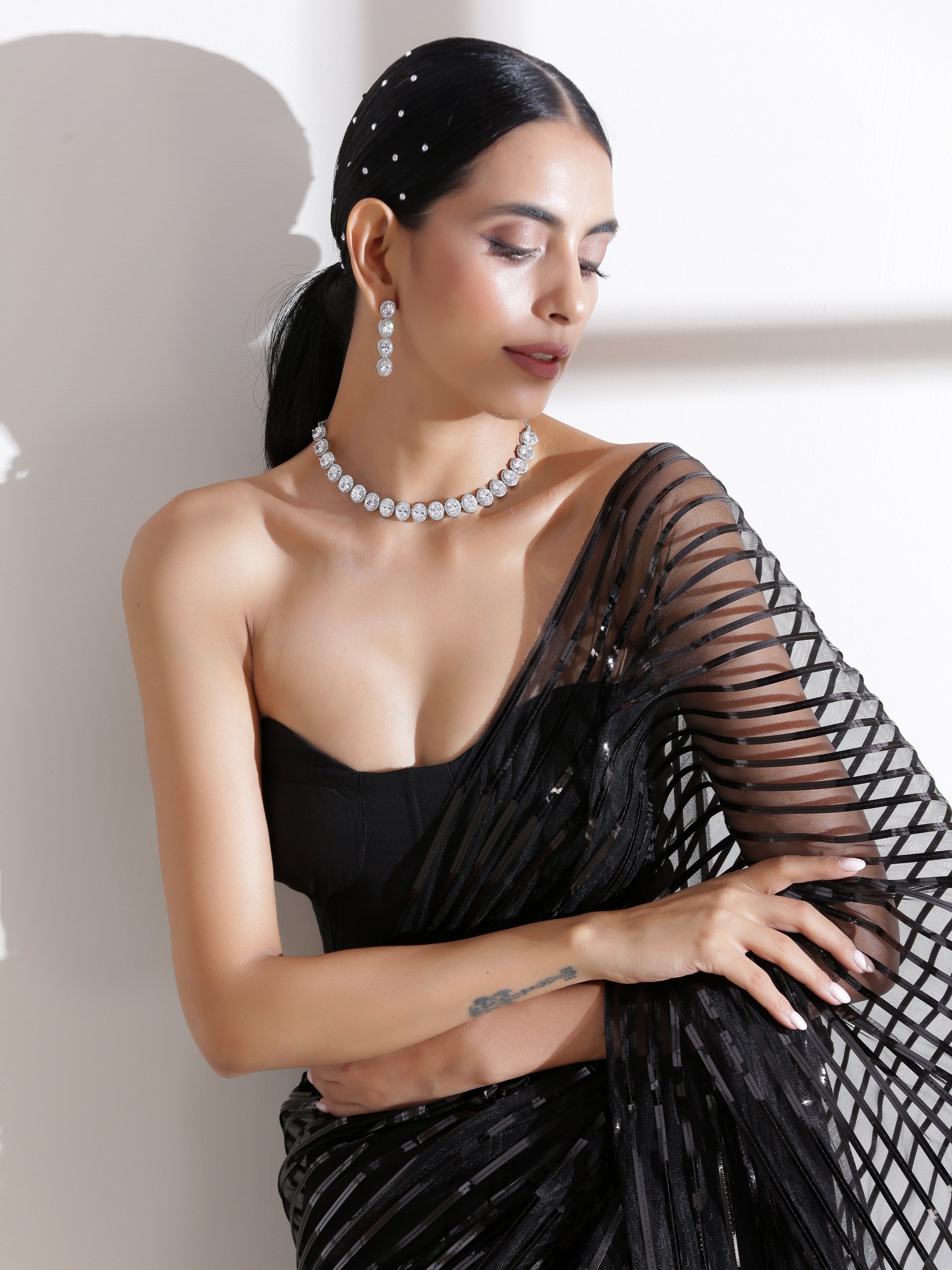 Grey Gold Chiffon Saree With Lace & Pendant on Ends