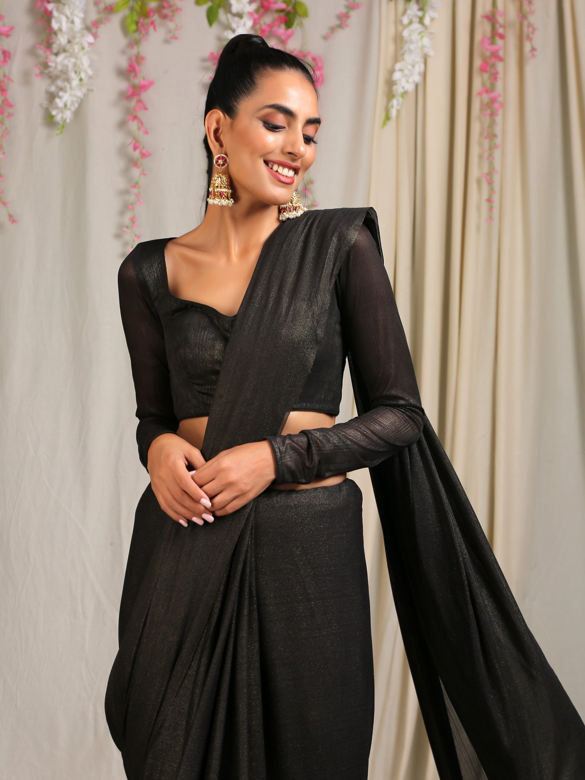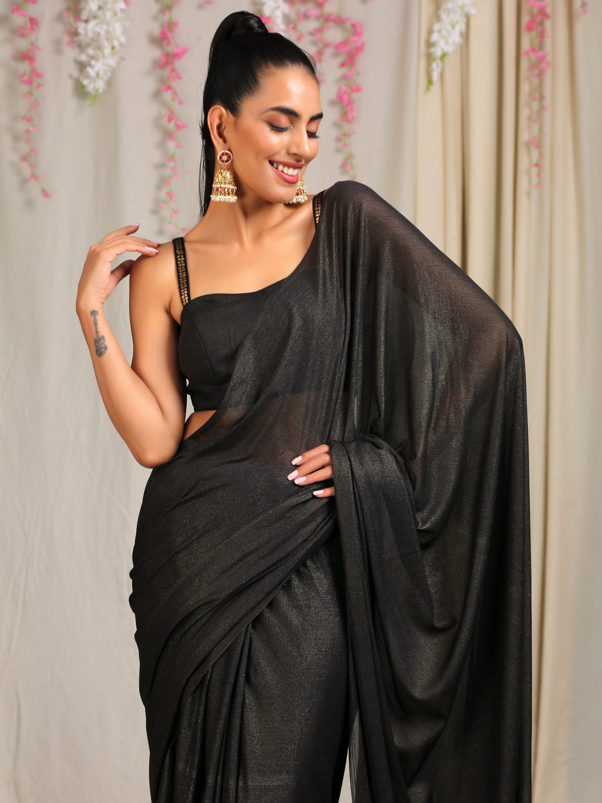 Colour:?Black?Saree with gold sheen. End on Pallu?has hand made a dull gold pendants.